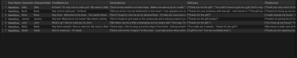 This will be a long one once again, so here we go. Across the level, there are characters that the player can interact with and make friends with. Each one is a child actor of the parent actor BP_Character. This parent actor houses all of the code that makes the characters do their thing, while the child actors house their walking path and favorite gift (basically all the things that are instance editable). All of their dialogue lines are stored within a Character Data Table.
